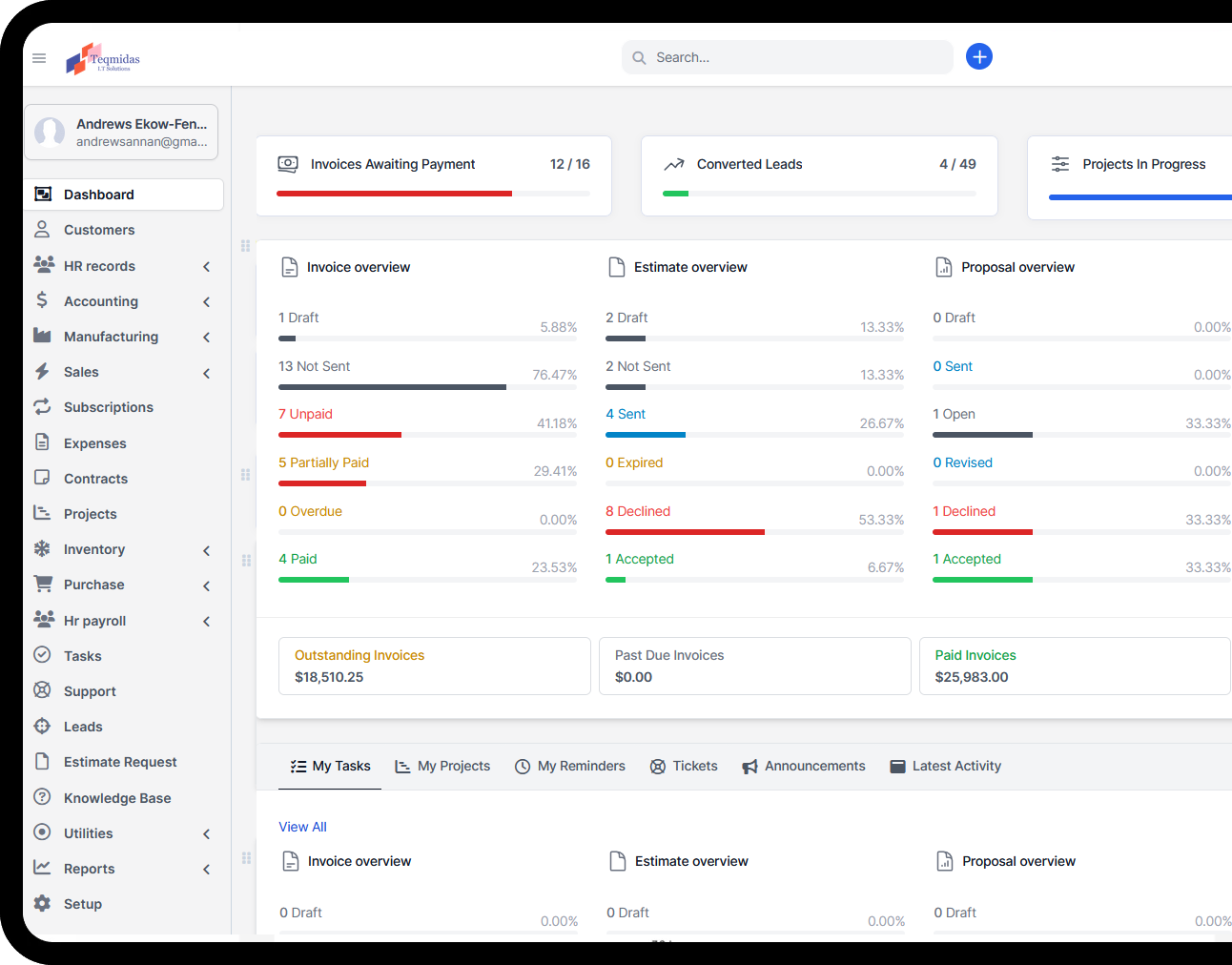Manage and invoice projects with our powerful project management feature. Track expenses and time spent on tasks and bill your customers. Ability to assign multiple staff members on task and track time logged by assigned project member.